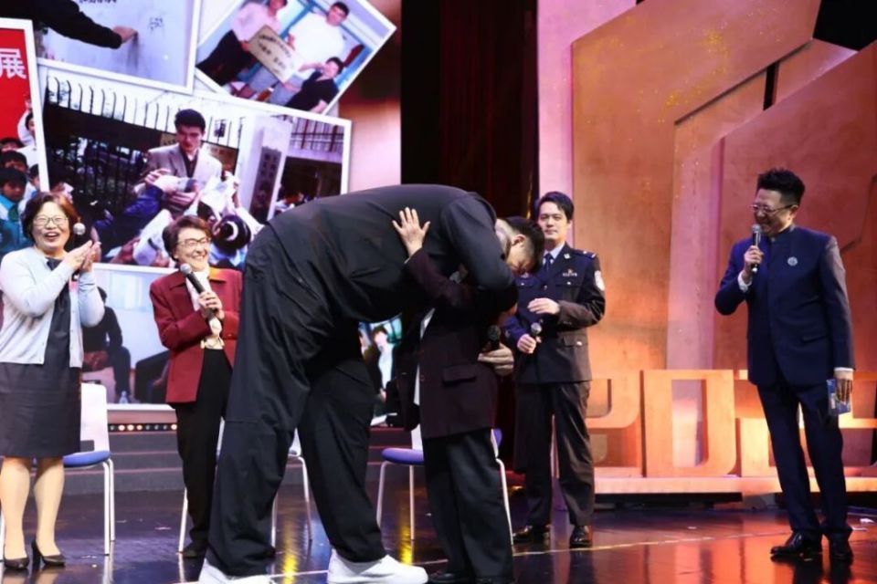 拥有76厘米身高差,姚明在母校校庆现场与小学班主任拥抱